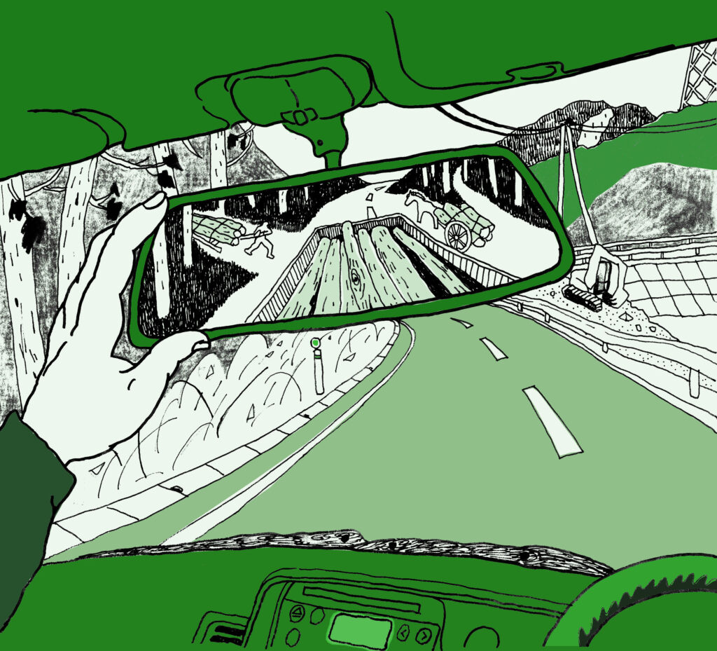 “woods in the rearview mirror” is an archive of a research project by kenchiku-downers, ongoing since 2022, which explores the relationships between mountains, timber, and architectural production.