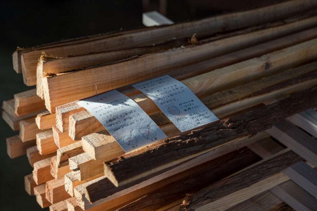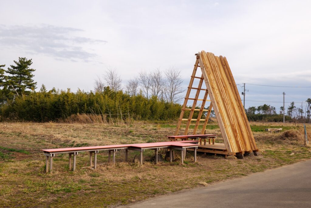 2023年2月のオープンスタジオで乾燥させたスギと、この年新たに丸森町の親林で伐られたスギは、仙台市宮城野区新浜地区の畑へ運び、立て掛けるようにして日よけ屋根を制作した。雨風や日にさらしながら乾燥させる。同じ木から取られた板を順番にならべ、もともと1本だった木の形を表わした。訪れた人には、山に生えていた時の木の姿を想像したり、乾燥していく様子を見たりしながら、屋根の下で休んでもらう。夏至が近づくと、板と板の間にもたせた隙間から入る光が入る。