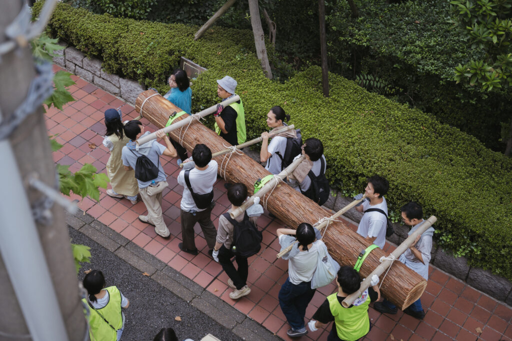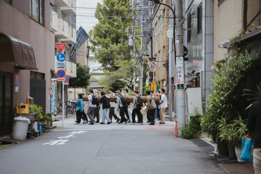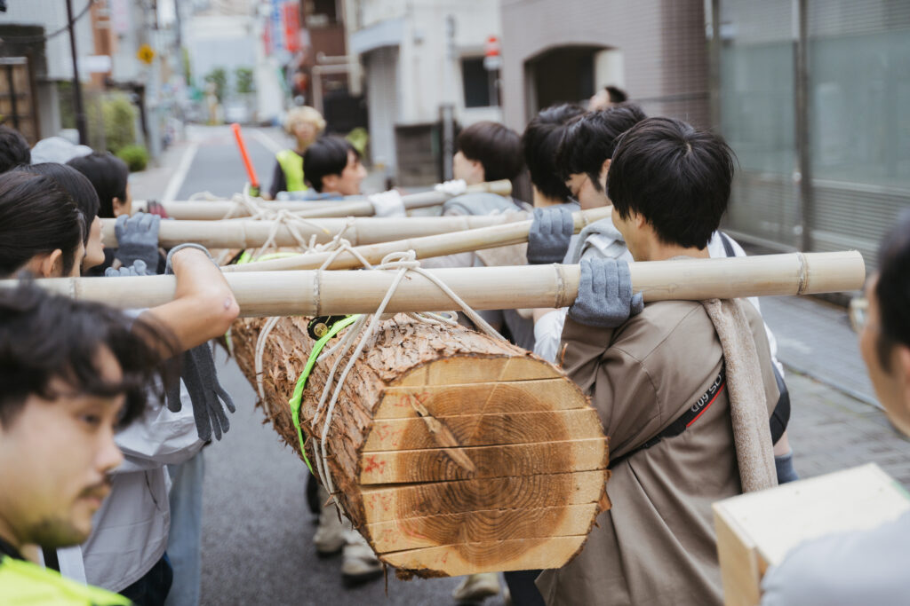 東京都港区にて、2023年に一度挽いてもらい乾かした板を再び束ねて一本の丸太の形にし、参加者と一緒に運ぶイベントを行った。1年近く乾燥させたとはいえ130kgの重さがあった丸太を12人で担ぎ、かつての材木町跡周辺を練り歩いた。