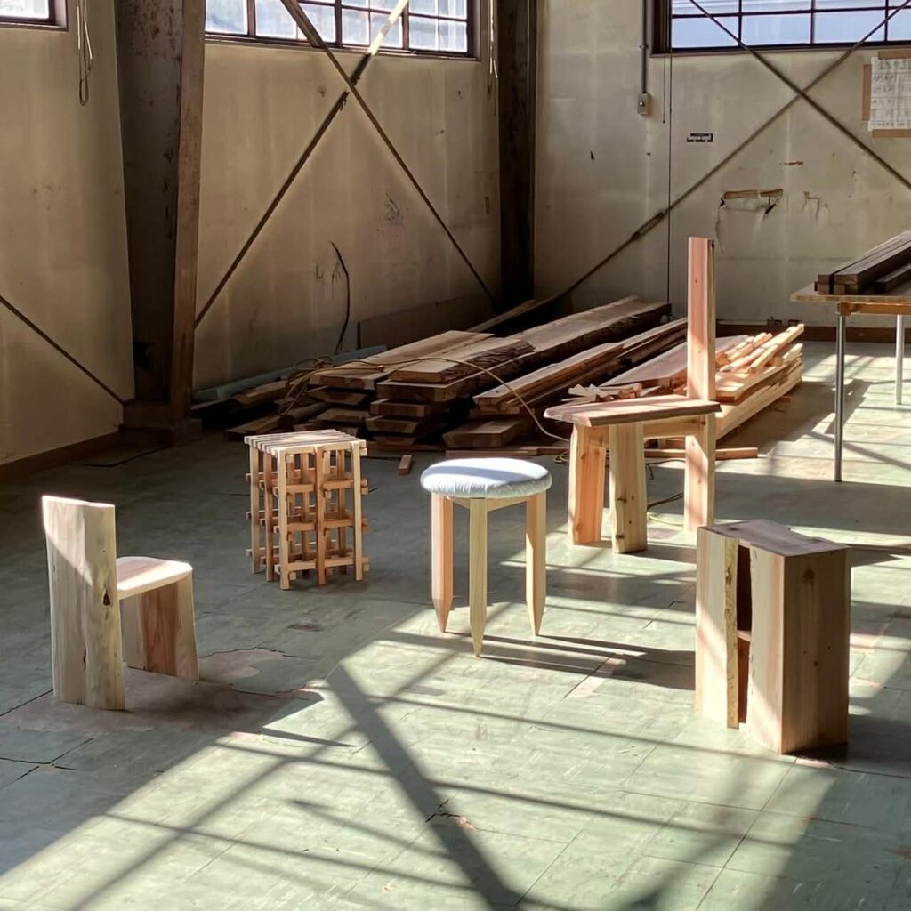 オープンスタジオや東京出張を経て1年以上乾燥させた間伐材を使って、これまで行ってきたインタビューの中から印象に残っている言葉やエピソードを形や工法に反映させた10種類の椅子を制作した。椅子に座ってもらいながら行うトークイベントを開いたり、オープンスタジオで展示したりした。