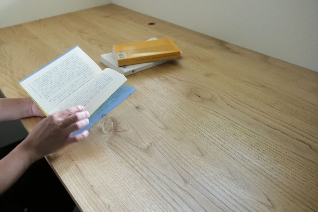 その後電動カンナで表面を平らに削り、幅の狭い板をはぎ合わせて一枚の天板を製作した。