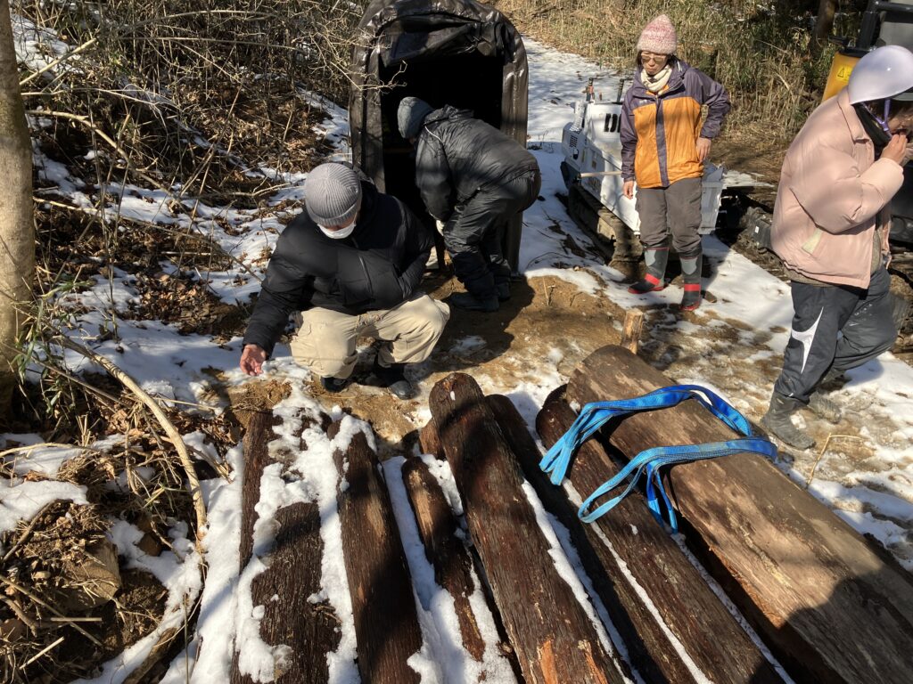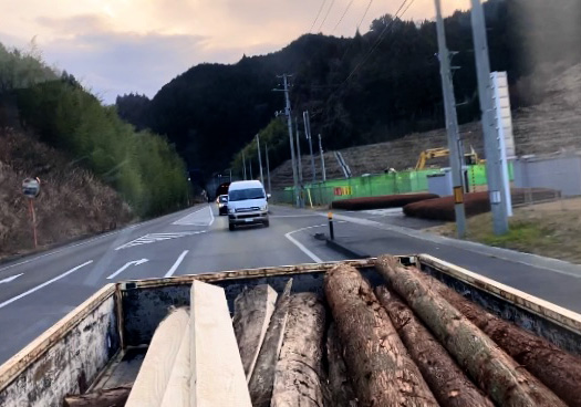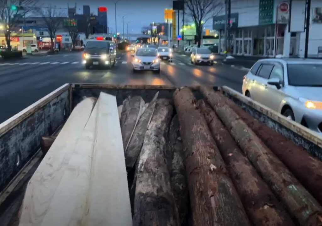 製材してもらった木材をトラックの荷台に載せ、丸森町から仙台市若林区六丁の目の作業場に運ぶ。道の凸凹で車体が跳ねる度、荷台の木が無事か確認しつつ走行し、無事仙台に到着する。伐られたばかりの丸太は水分を含んでかなりの重量で、バックホウにもフォークリフトにも頼れない作業場で、三人で引きずるようにして運び入れた。