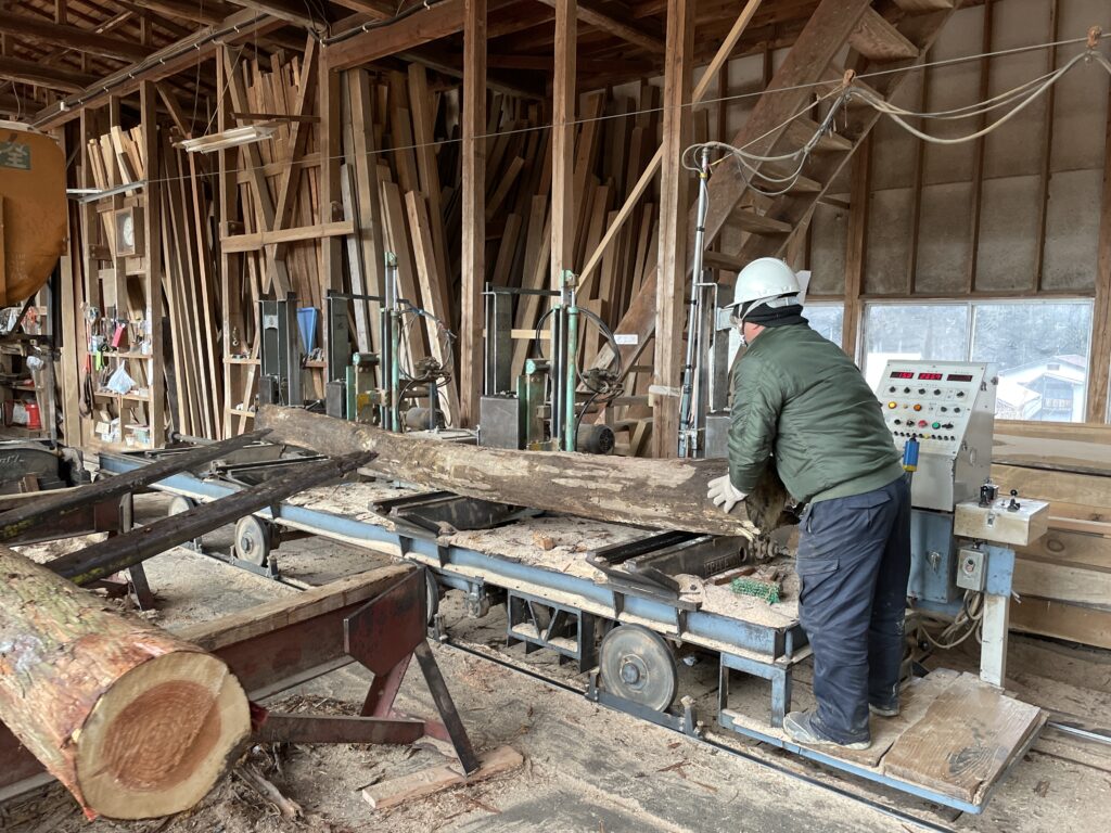 小野材木店に到着した丸太が、小野さんの見事なフォークリフトさばきで、帯のこを通す台車の前に運ばれる。何本かを賃挽きしてもらうことにする。材寸の指示は、尺寸でやり取りされる。慣れていない私たちはいちいち頭の中でmmから寸へ変換する計算をしながら、なんとか取りたい寸法を伝える。スギ材の一本は建築ダウナーズがそれまでホームセンターなどで最もよく購入していた材寸の一つ12割材(断面寸法が24×36mm)と同じ寸法に、一本は1寸(約30mm)の板材に、もう一本は住宅などに使われる一般的な柱の寸法である105mm角と、残った部分は余りが出ないようにお任せして板に挽いてもらった。クリ材は曲がりの方向を見てもらいながら、3枚に挽いてもらった。あれこれ悩んだり、質問したりしながら1時間ほどで製材が終わった。