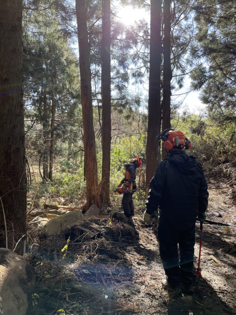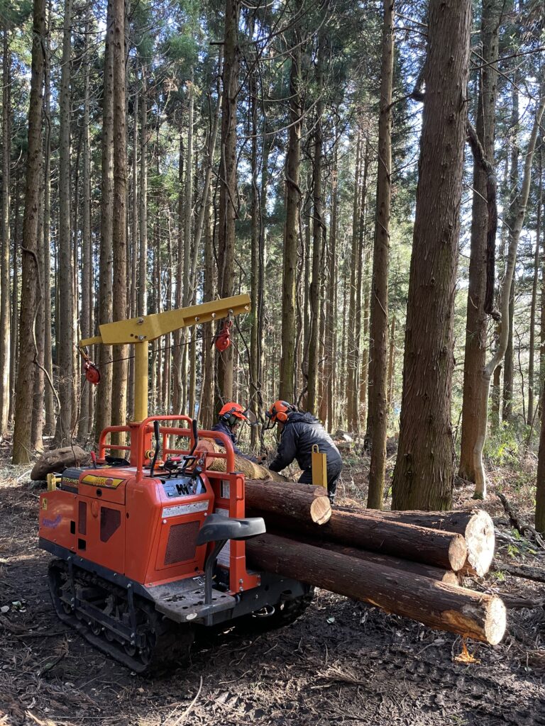 Woods and People MARUMORIが整備する丸森町の研修の森「親林」を初めて訪れた。この日は刈田さんと島影さんに作業を見学させてもらう。まず作業道入口付近で立ち枯れて倒木の危険があったクリの木を伐採していく。その後、すでに伐採されて林の中に点在していたスギの間伐材を林内作業車に刈田さんと島影さんの二人で協力して積む。作業道の上の方から、山を下りながら集材していき、土場へ運ぶ。